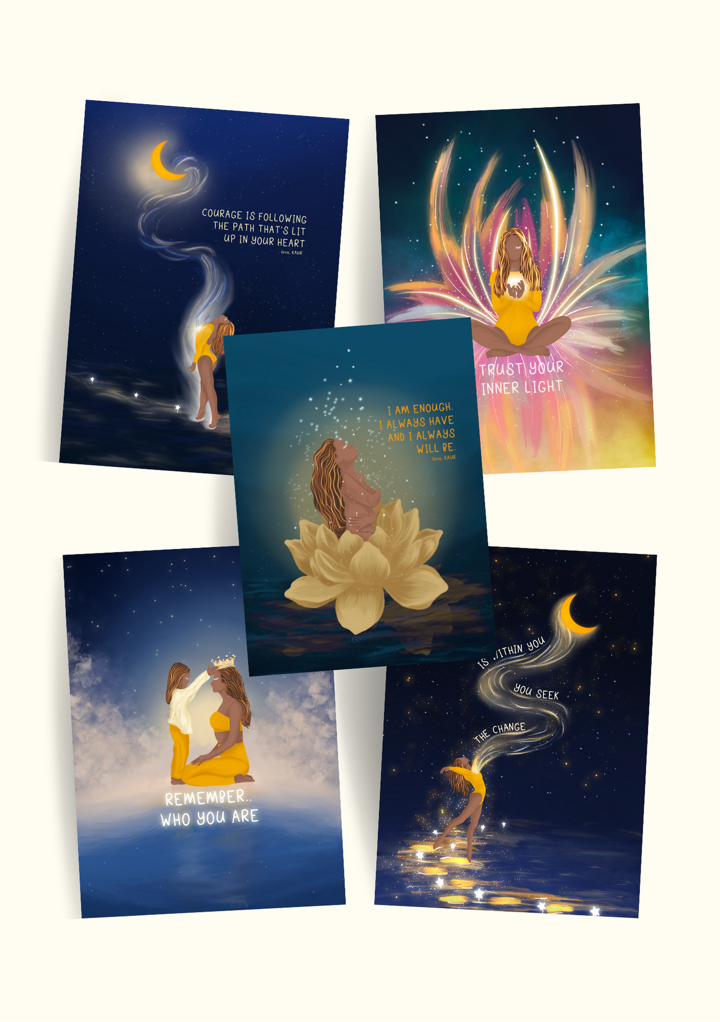 Courage Set is a reminder of the strength already within you. The mini print cards in this set are invitations to trust your heart, to walk boldly in your truth, and to remember your enough-ness. Each one carries a spark of light to help you return to yourself, embrace change, and honor the courage it takes to simply be who you are.